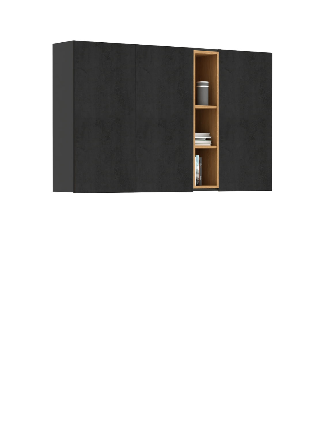 Dubové telo, hrana ABS a krabicové police. čierne čelá s betónovým efektom. Šesť uzavretých políc.