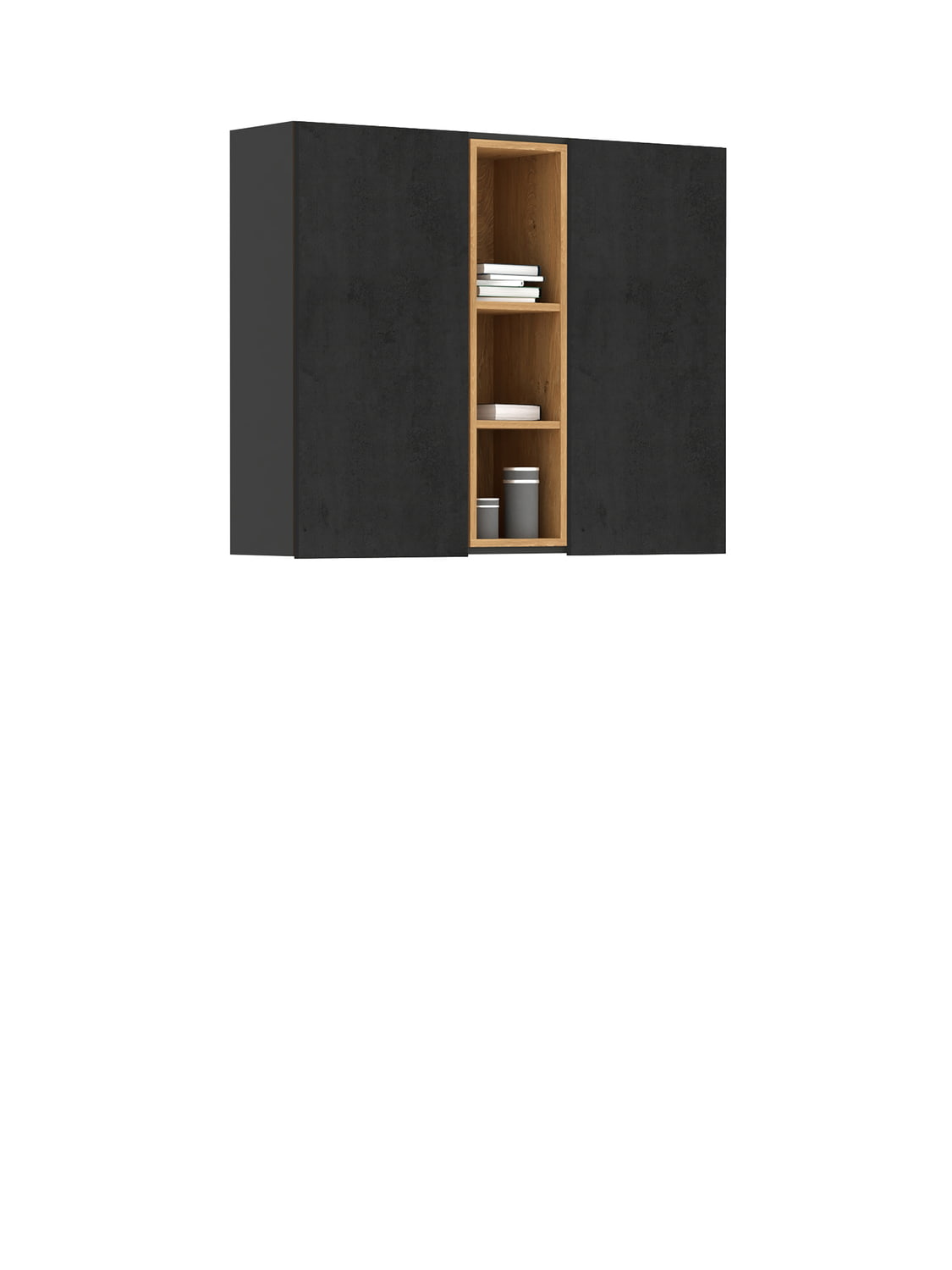 Dubové telo, hrana ABS a krabicové police. čierne čelá s betónovým efektom. Šesť uzavretých políc.
