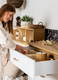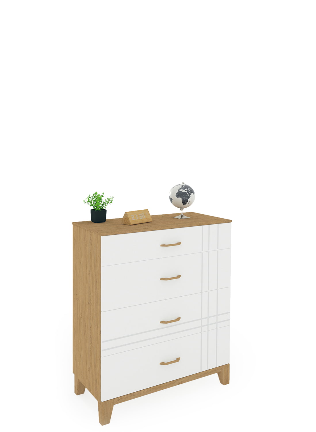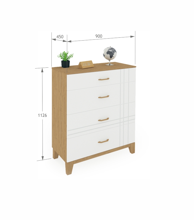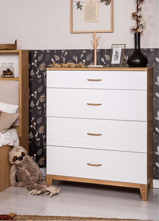 Regál v škandinávskom štýle. Priestranné zásuvky zakončené drevenými úchytkami. Doska stola, korpus z laminovanej dosky vo farbe dreva. Nohy a rúčky z lakovaného dubového dreva.