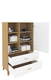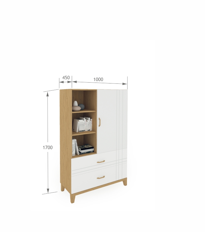 Regál v škandinávskom štýle. 3 úložné systémy - priestranné zásuvky, police na knihy alebo dekorácie a uzavretá skrinka. Biela, matná predná strana. Nohy a rukoväte vyrobené z lakovaného dubového dreva.