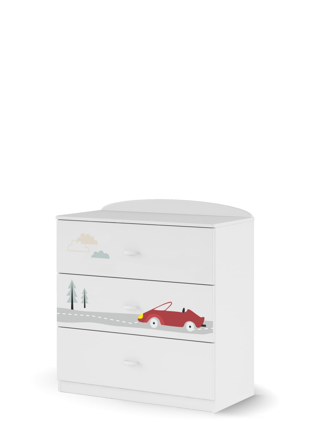 Komoda s tromi priestrannými zásuvkami. Čelá nábytku sú natreté farbami, ktoré spĺňajú európske normy a bezpečnostné požiadavky na hračky a sú tvrdené UV svetlom. Biela karoséria a auto vyryté na jednom z predných dielov v kombinácii s príjemnou krajinou z výletu tvoria leitmotív kolekcie. Na každom kuse nábytku je iné auto.