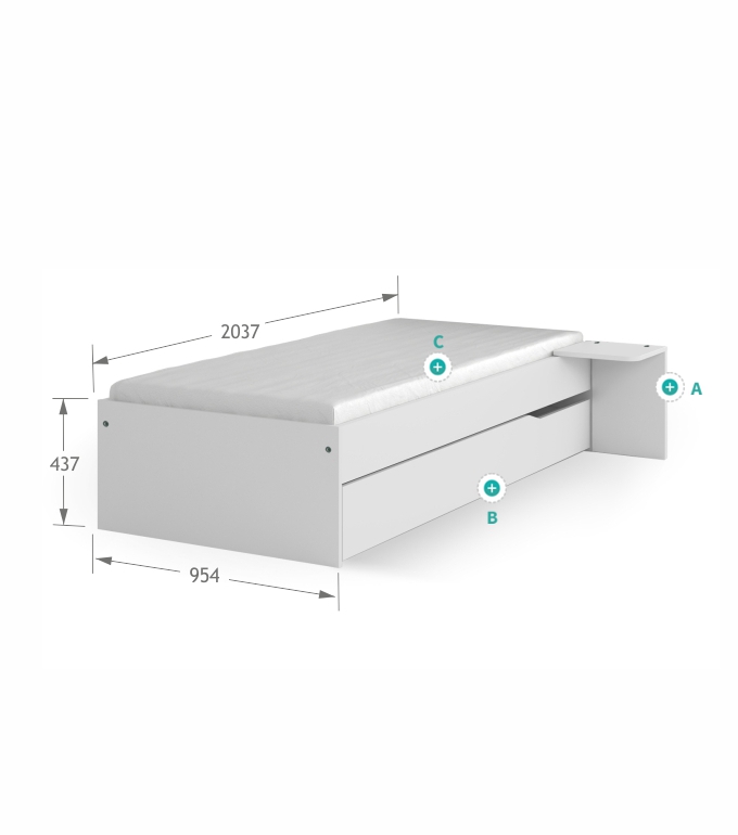 Posteľ bez vysokej opierky Konštrukcia z bielej laminovanej dosky.